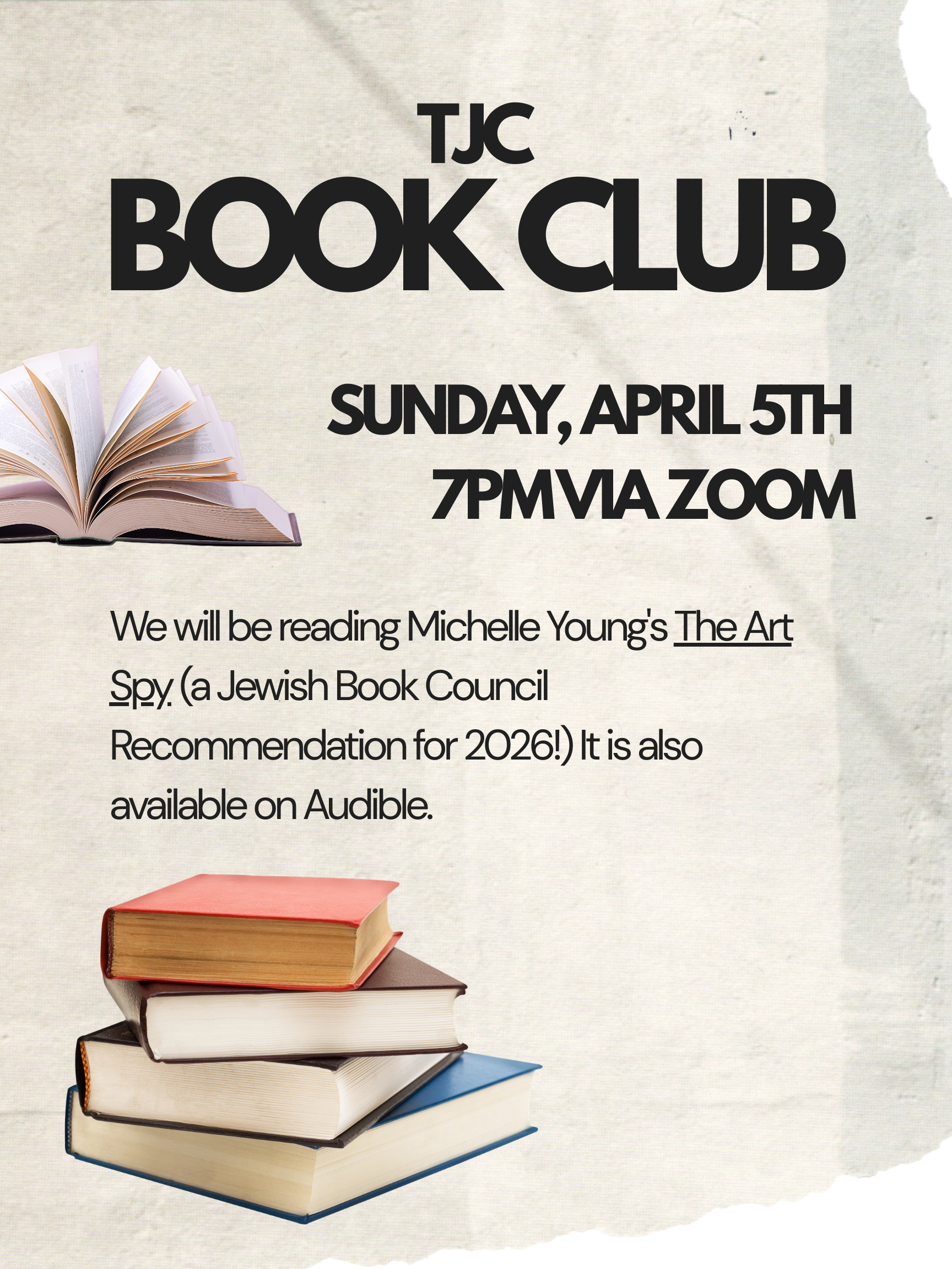 Join us via Zoom to discuss this month’s book, The Art Spy, by Michelle Young, a Jewish Book Council recommendation for 2026!