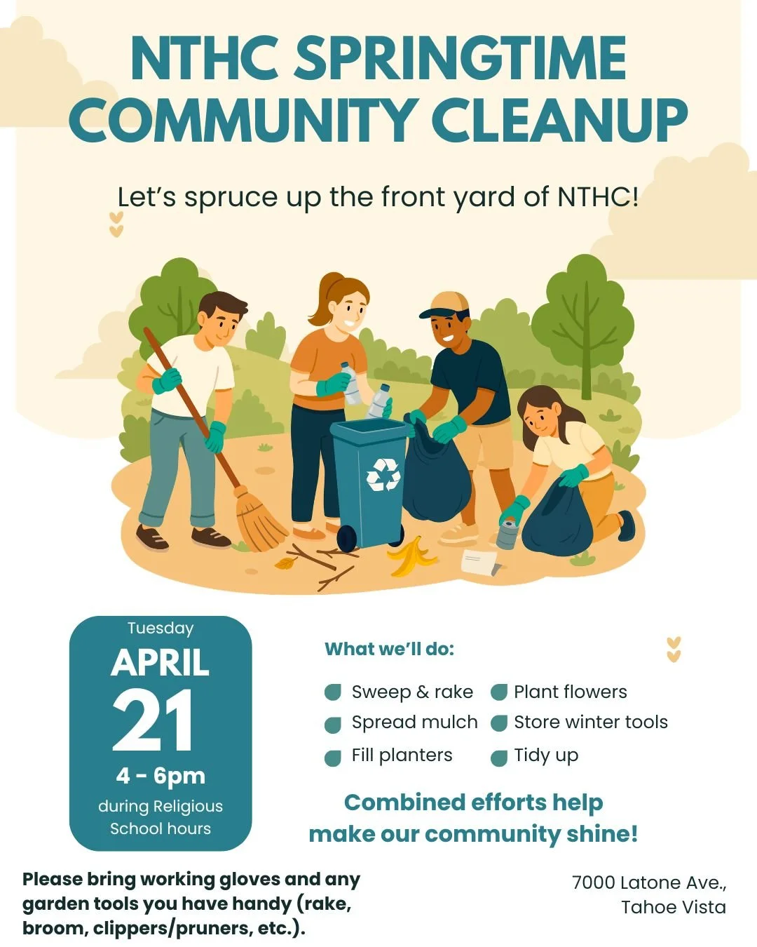 Join us on Tuesday, April 21 from 4–6pm for the NTHC Springtime Community Cleanup to help spruce up our front yard together.