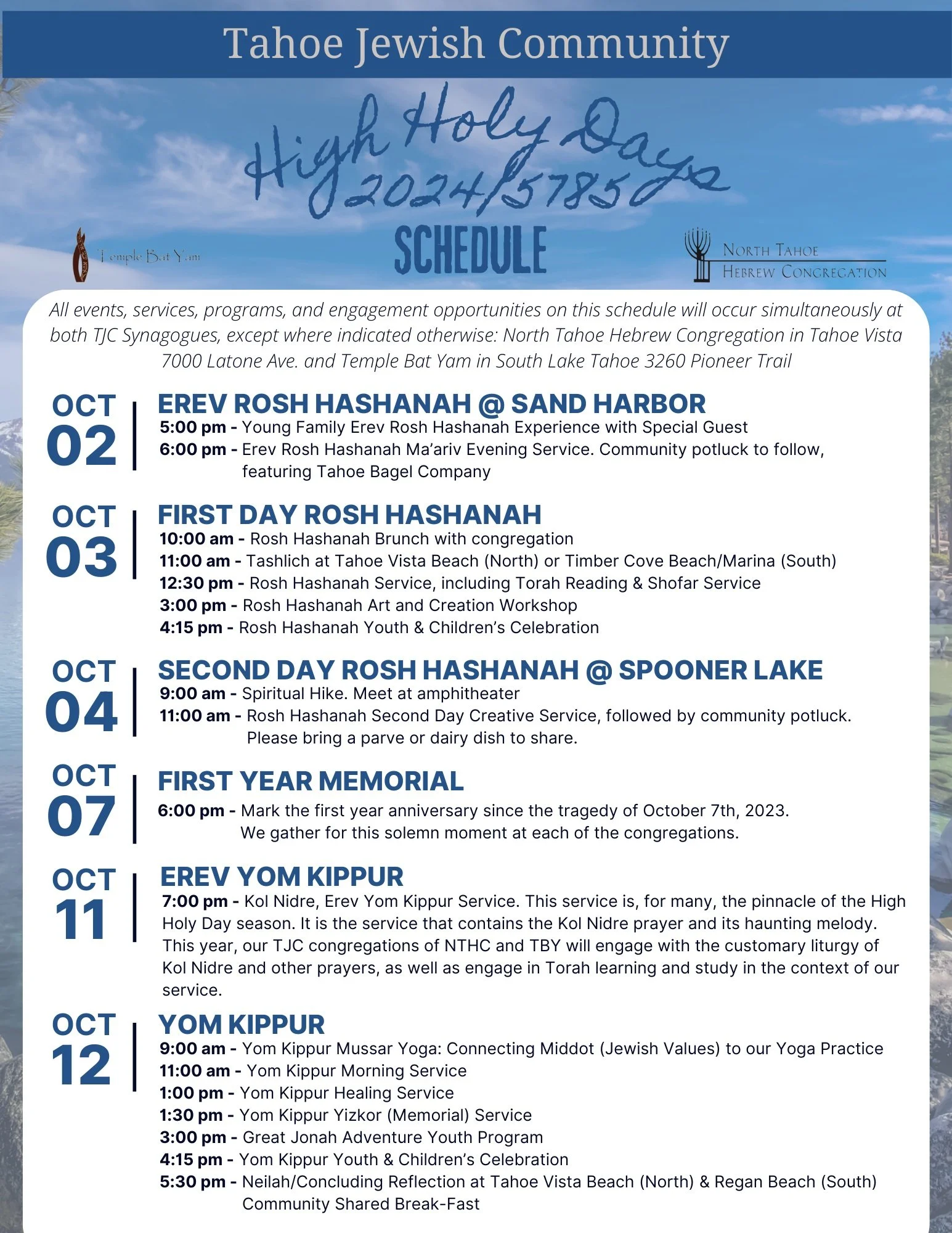 6:00 pm - Erev Rosh Hashanah Ma’ariv Evening Service. Community potluck to follow, featuring Tahoe Bagel Company